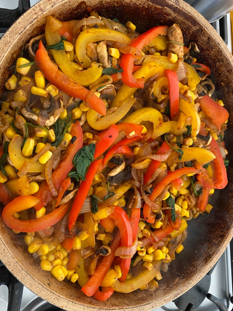 I started by microwaving three sweet potatoes and slicing up the veggies. You can choose what you like but I chose onion, red pepper, mushrooms, sweet corn, and a bit of spinach. I thought about adding in my artichoke hearts as well but decided I had enough…considering I had leftovers I think I was right. I used some vegetable stock in a hot pan to start off the onions. Once those were starting to soften up nicely I added in the rest of the vegetables. While the vegetables were cooking I added in 1tsp smoked paprika, red chilli flakes, black pepper and 1 tsp liquid seasoning. Cooked until soft and set aside.
