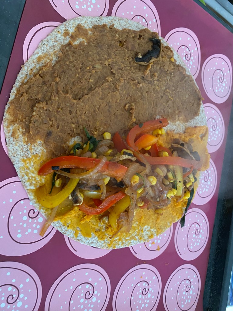 I am in England where getting things like fat-free refried beans is near impossible so making my own was the only way to make this work for me. If you aren’t forgoing oil than the shop bought should be fine and if you are in the States I am sure your supermarket has an oil-free option. Without the stickiness of the beans and sweet potato I don’t think this would work but this was I was still able to pick it up and eat it like a sandwich so I find it successful.