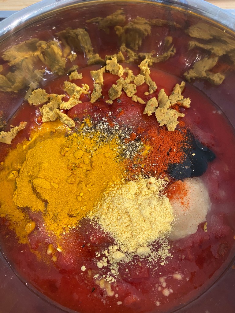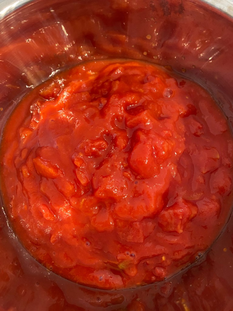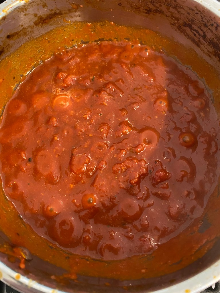 Mix all the ingredients and bring to a boil. Reduce the heat and simmer while stirring regularly. You want the sauce to get to a deeper red and reduce a bit. Once you get your sauce to a consistency you like turn off the heat and use a silicone spatula to scrape in all into a container to cool before keeping it in the refrigerator. I made enough for two jars of sauce (my jars are 500ml size).