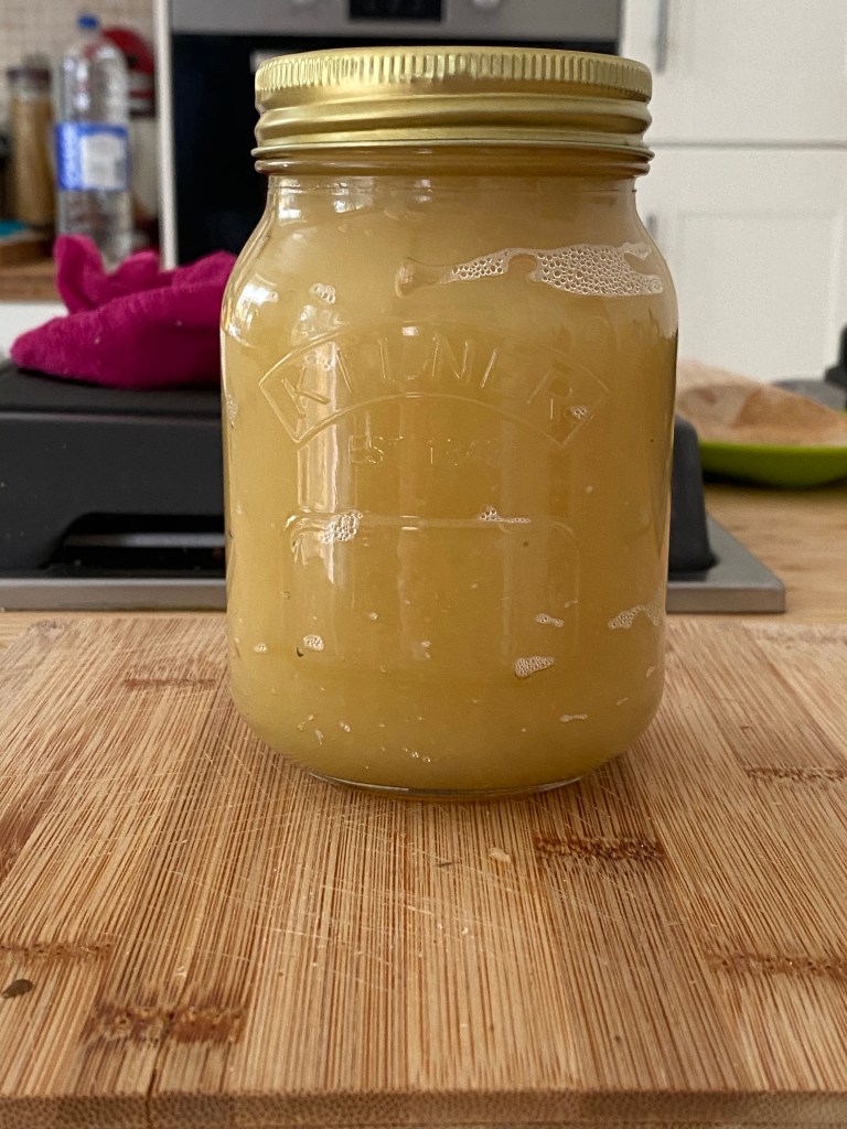 While still in the pan use the stick blender to purée the apple. This is applesauce. Carefully pour the applesauce into a jar (my six apples filled a 500ml jar to the top) and keep in the refrigerator. Use within a short time.