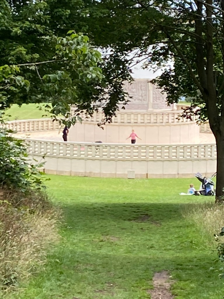 As you head down the hill you will see the Peace Pagoda on your right. I will admit that we made a wrong turn so I don’t have good pictures of the Peace Pagoda. We thought there would be a path on the right but it didn’t lead anywhere so we went off-road to just get back down to the path. You can be sensible and keep the pagoda on your right to the bottom of the hill and turn right. When you reach a fork bare left with the mini Stonehenge style sculpture on your left.