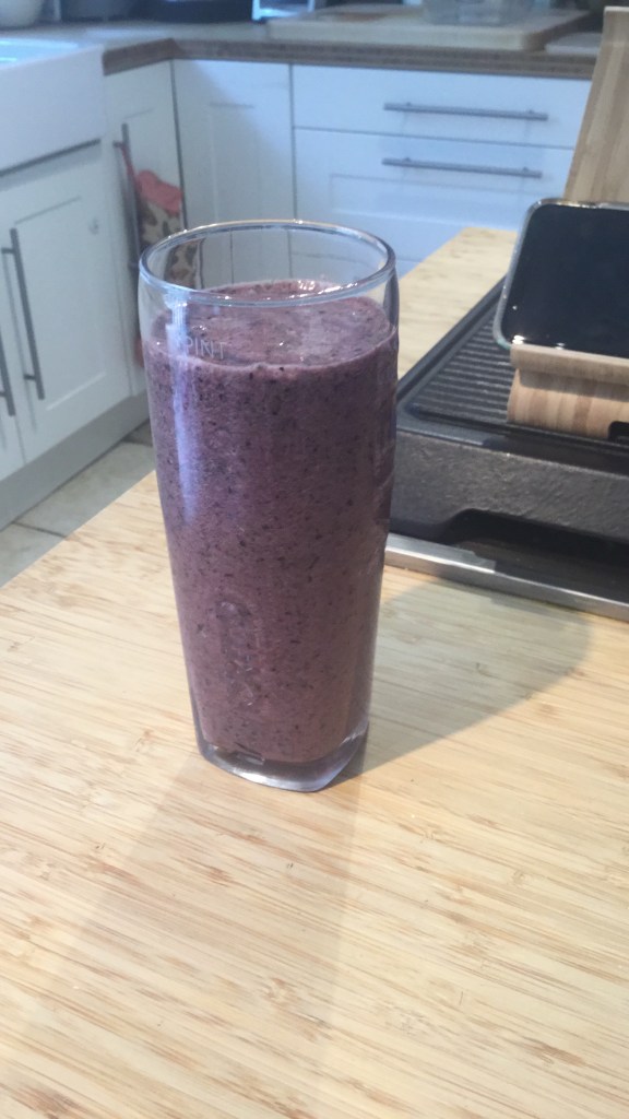 I blended it all up in my Ninja Blender until it was smooth. It was more like a fruit chiller than a creamy smoothie. Lately I quite like this but I imagine I might switch back and forth between this and my old milkshake like smoothies.