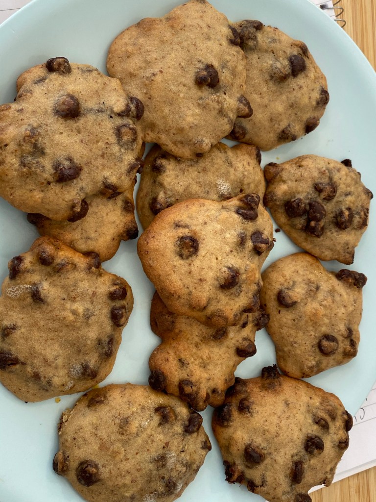 My day was spent testing my chocolate chip cookie recipe in addition to doing some bulk cooking on lentils. The cookie recipe is not ready. I had previously done it with oil replaced by peanut butter and it was good but it was still fat. Today I used applesauce and the taste was good but something was not right with the texture. I think it was the flax with white flour (was out of the whole wheat). The texture came out sort of like a bagel….very chewy in a bread like way. More experimenting to do yet as perfecting your chocolate chip cookie recipe is of eminent importance. By the way, I only ate two.