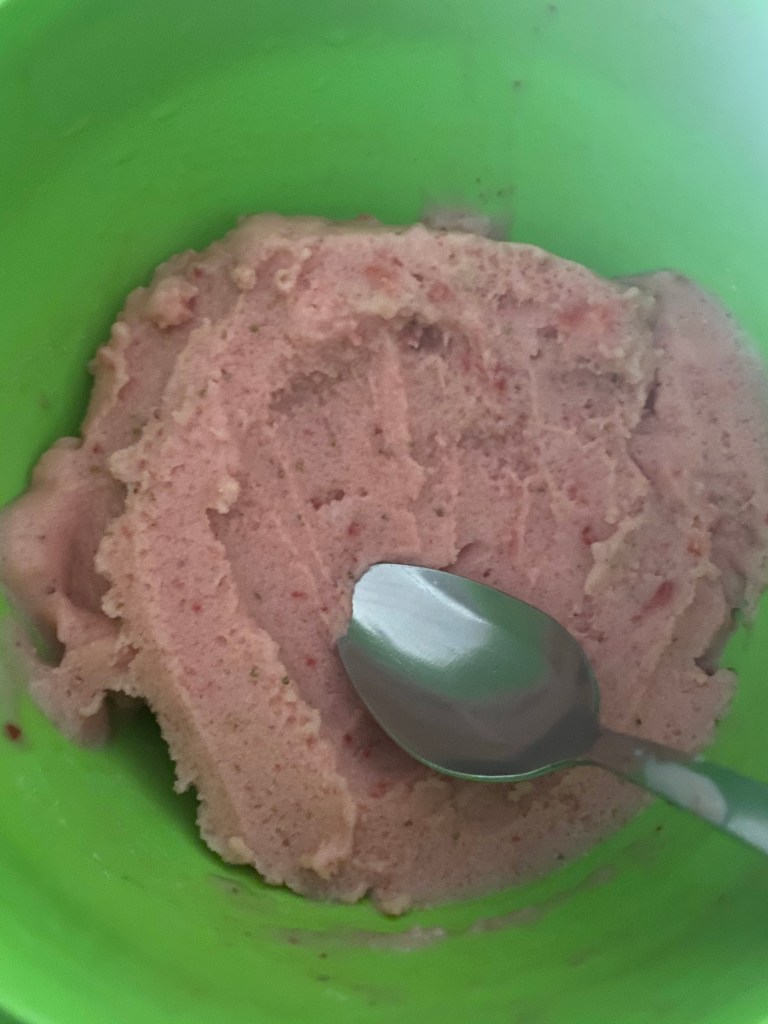 I have a Ninja blender which is very good but it isn’t the top of the line blender so the milk is there to help it blend down. I had to stop and scrape down repeatedly but it was worth it. I scooped it into bowls and put it in the freezer until we were ready for dessert.