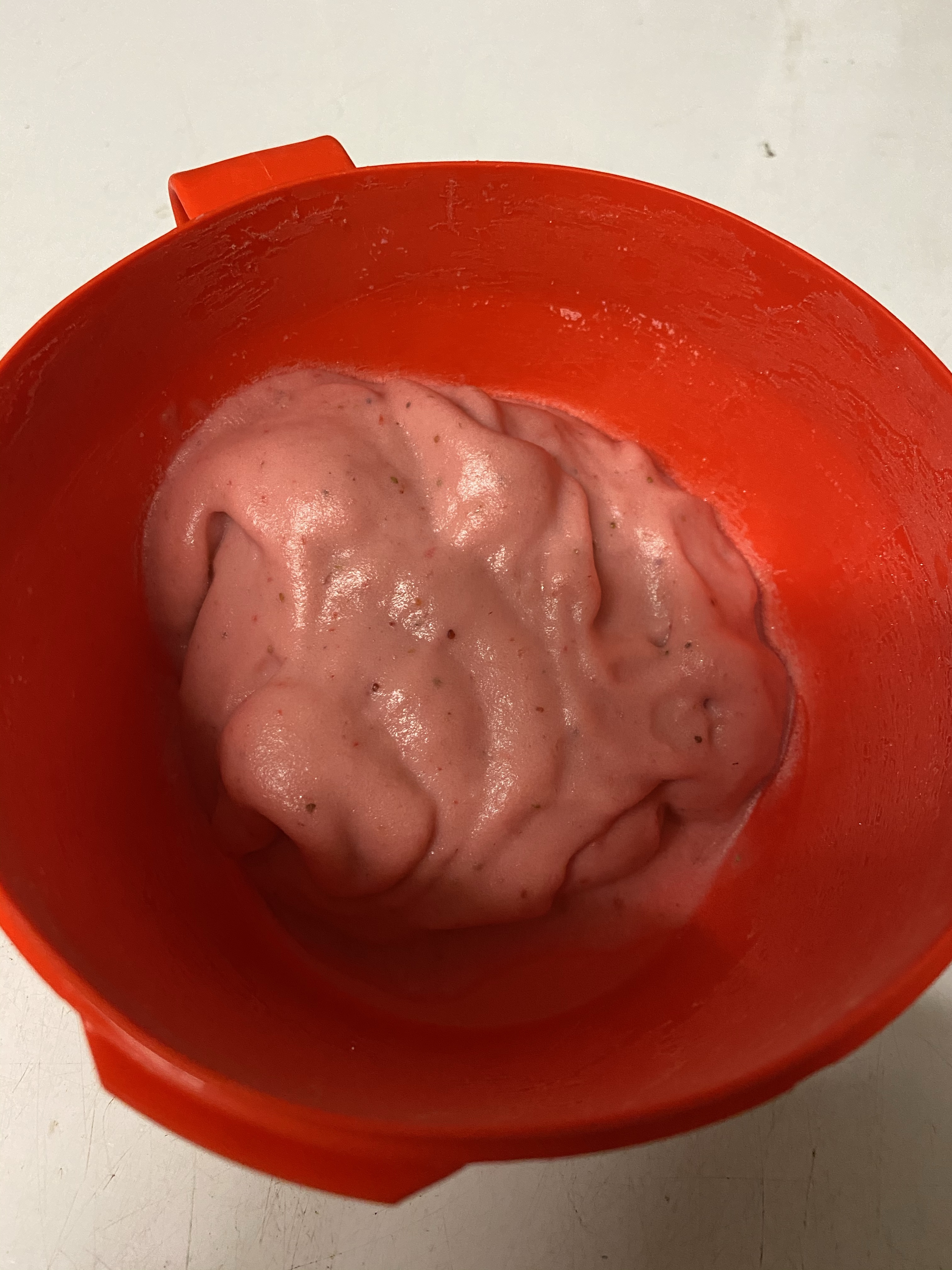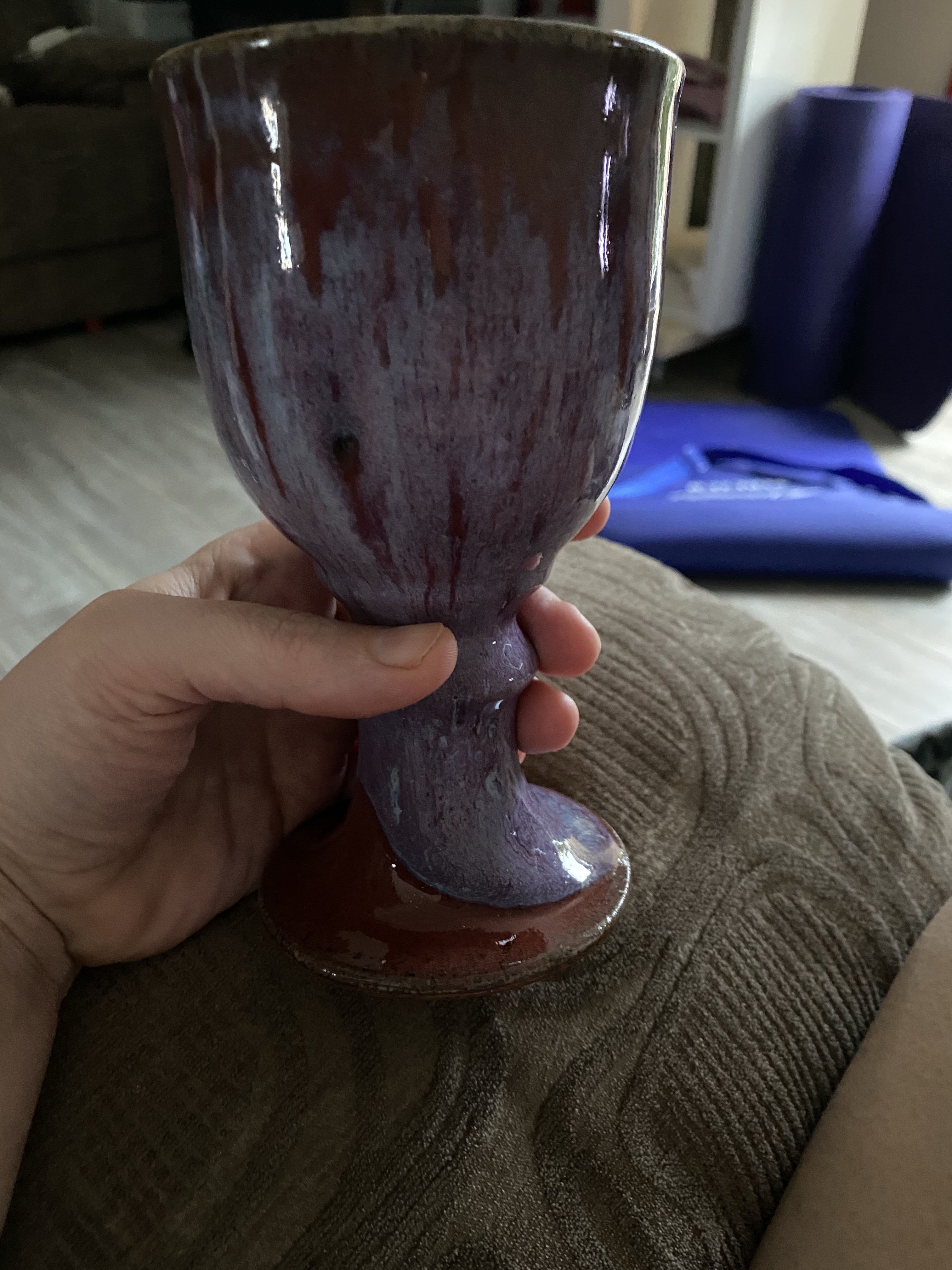 In the evening we pretty much always have a snack. Sometimes it is popcorn with Bragg’s aminos and nutritional yeast but this day was hotter than a witch’s titties (why is this even a saying? Whatever) I made nice cream with frozen bananas and strawberries. To that I added more of my chemical shitstorm of vanilla syrup and soya milk until you get it to blend into a good consistency. I know that syrup needs to go but I am not ready yet. In addition to the nice cream I had a bit of wine. Like my goblet? Everyone needs a goblet!