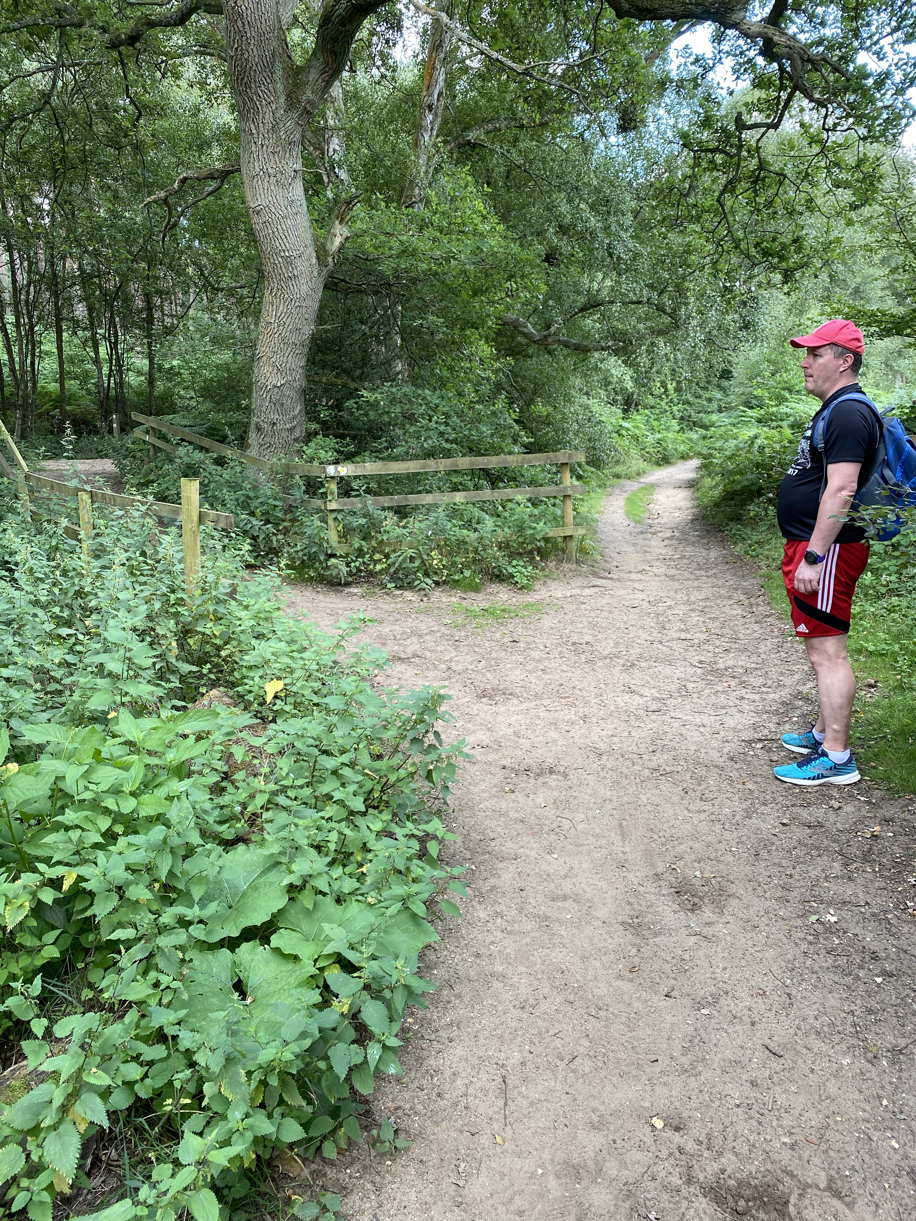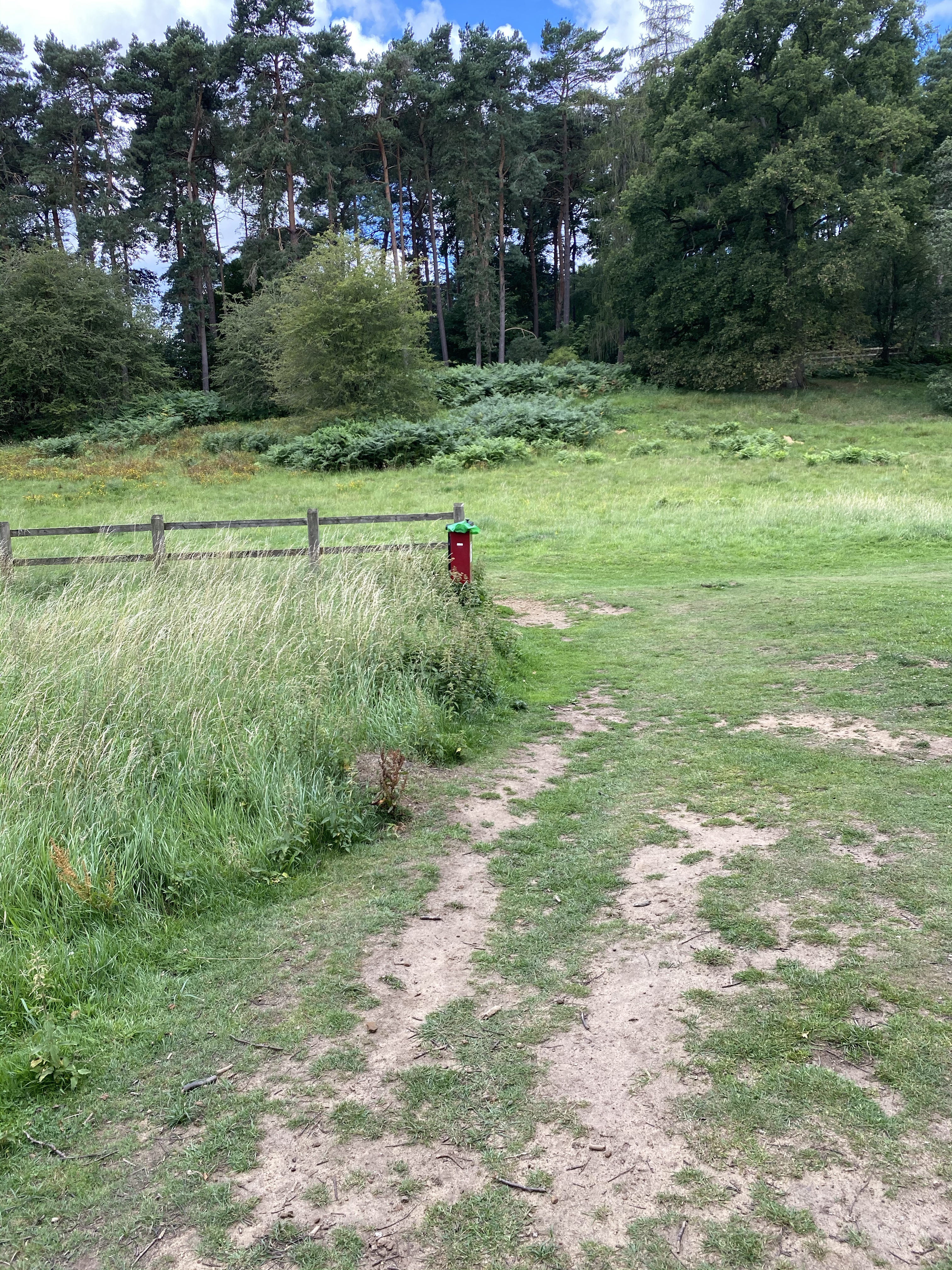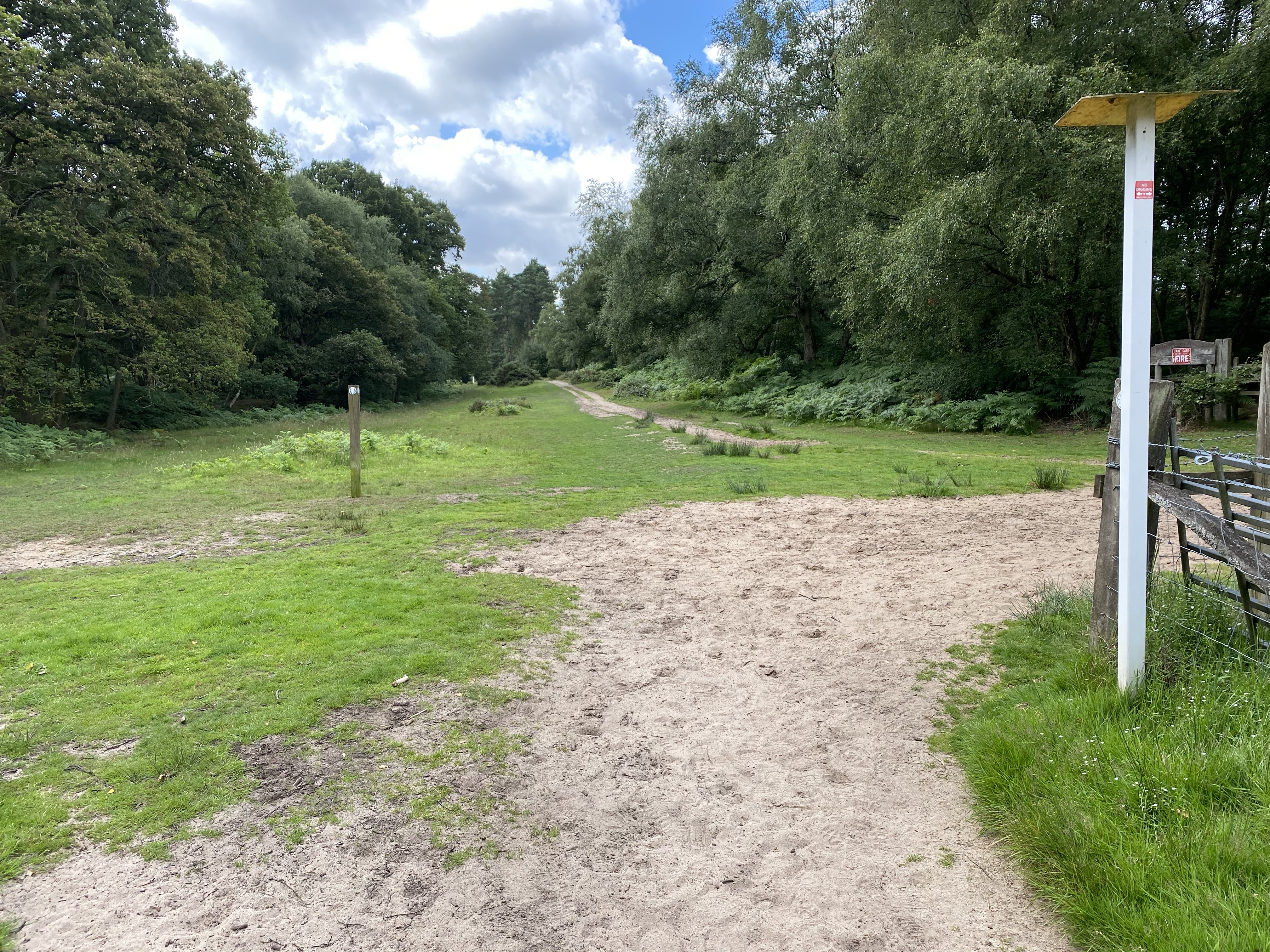 At the next junction we turned left. With Rammamere on our right the entire time we approach another junction. This one is a 4 -way option. You can see a green sign on the path to the left which is another map of Rammamere. This is just important for recognising where you are. At the junction you cross straight over walking on a sandy path. This leads into Stockgrove proper. You will happen across another smaller fork in the path that goes off to the left and slightly uphill (pic below). Pass by this and continue straight ahead.