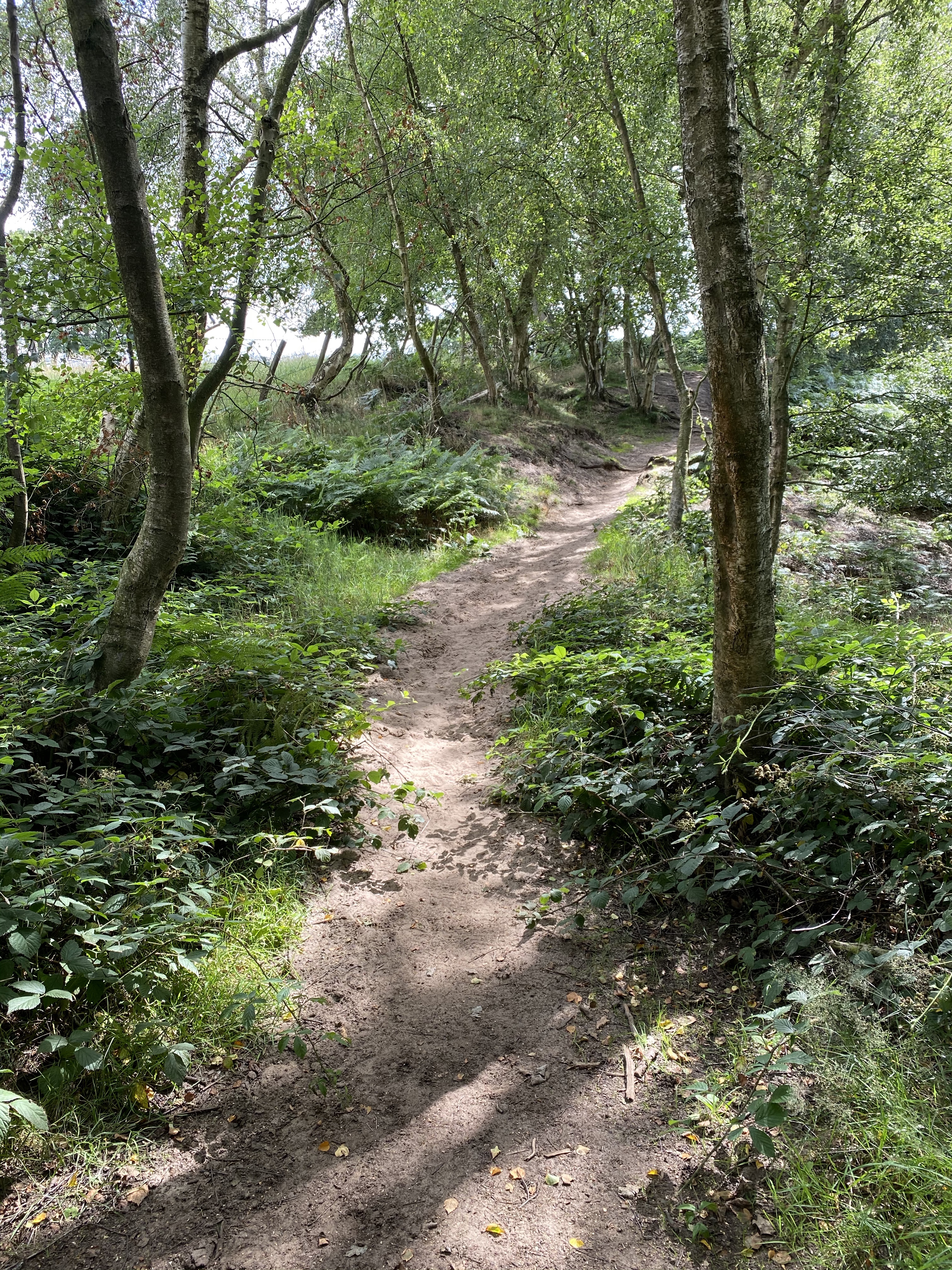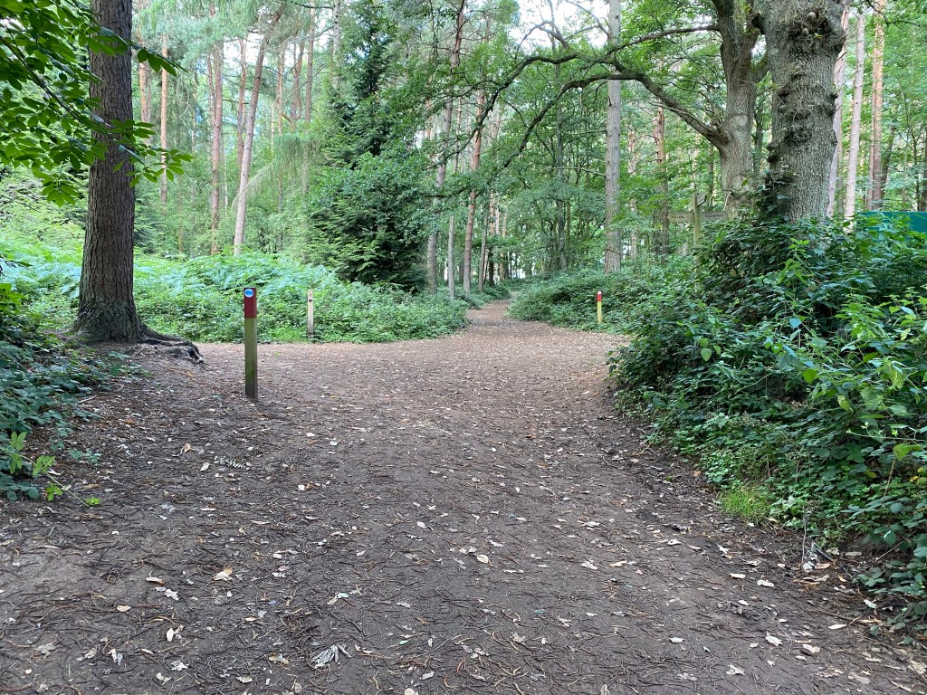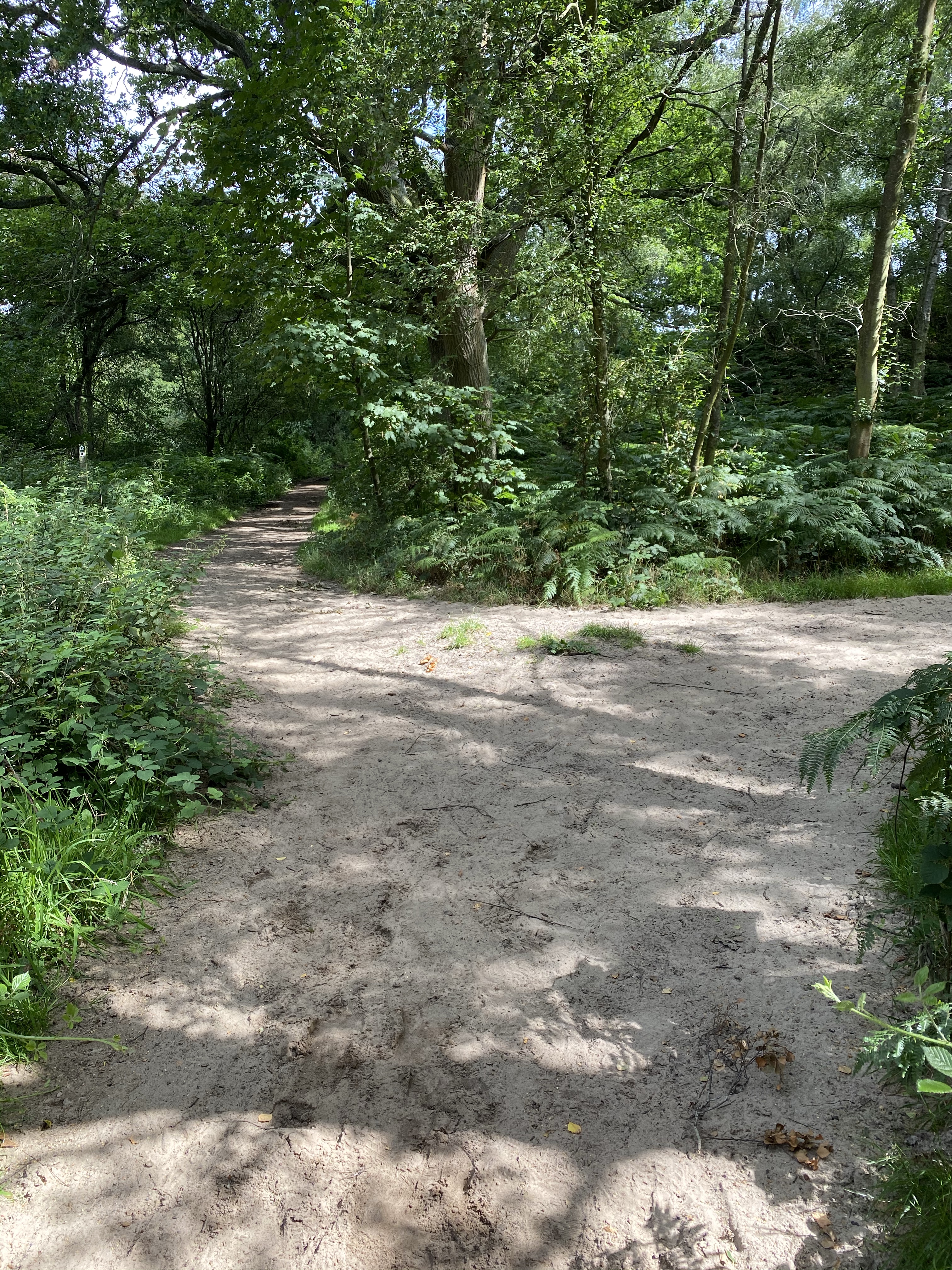 At the next junction we turned left. With Rammamere on our right the entire time we approach another junction. This one is a 4 -way option. You can see a green sign on the path to the left which is another map of Rammamere. This is just important for recognising where you are. At the junction you cross straight over walking on a sandy path. This leads into Stockgrove proper. You will happen across another smaller fork in the path that goes off to the left and slightly uphill (pic below). Pass by this and continue straight ahead.