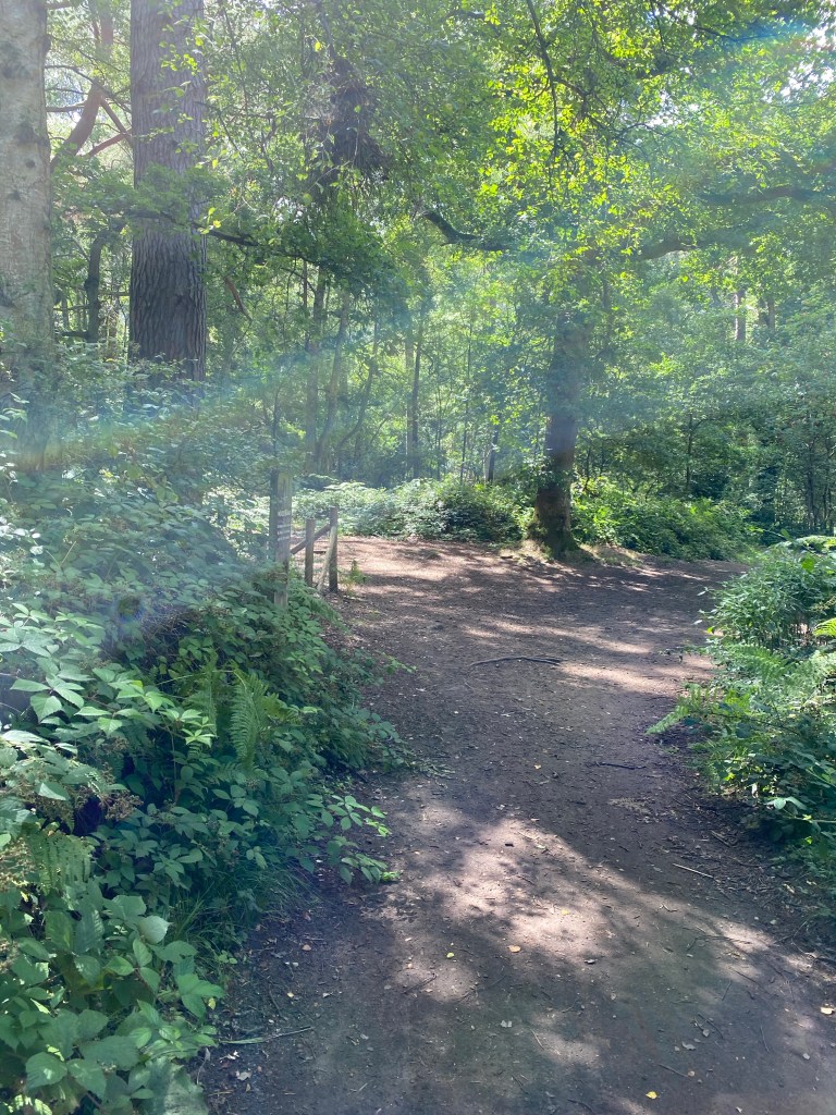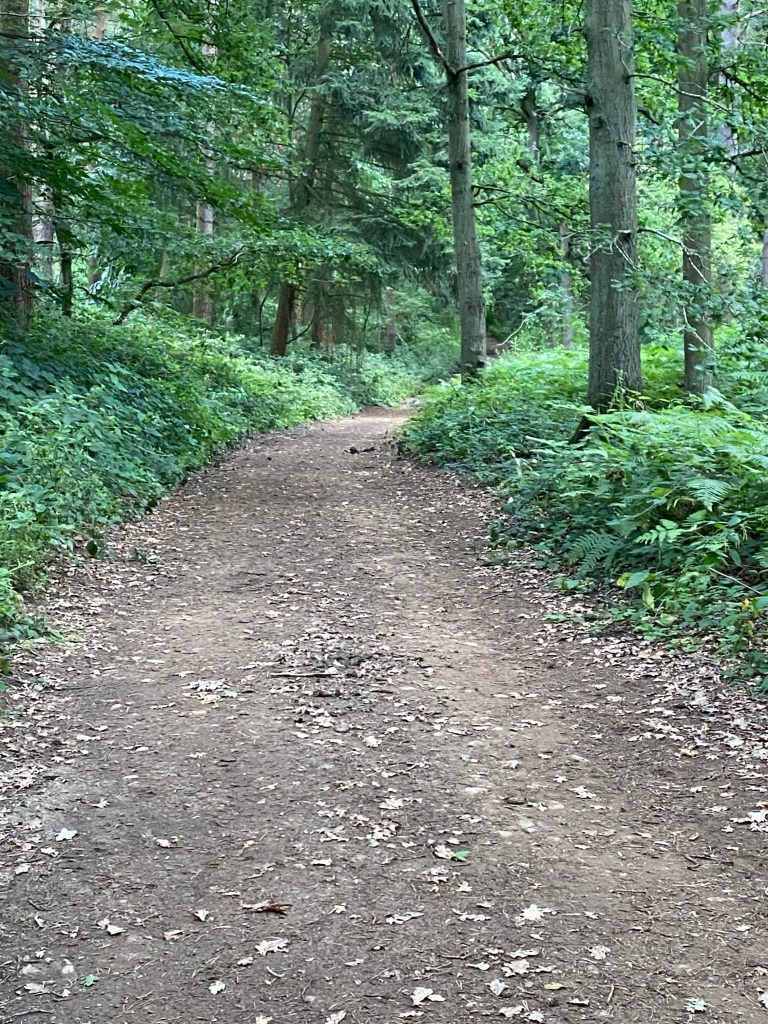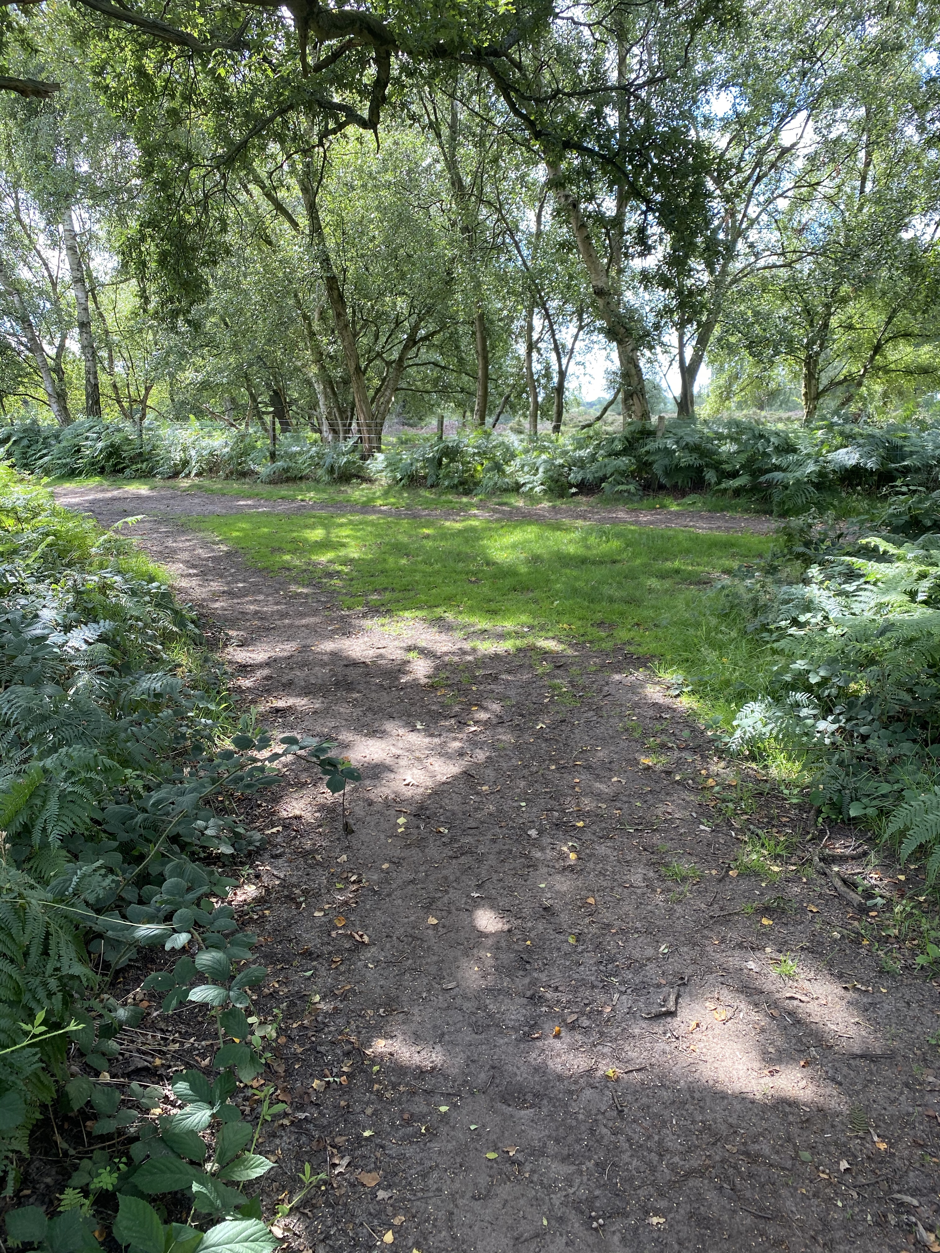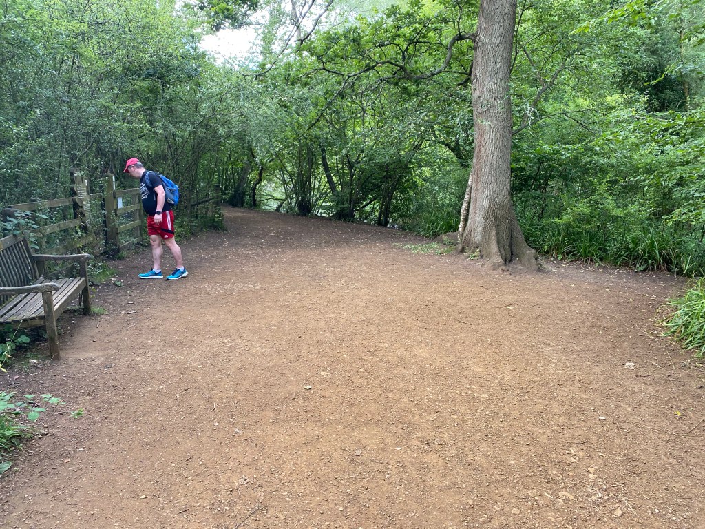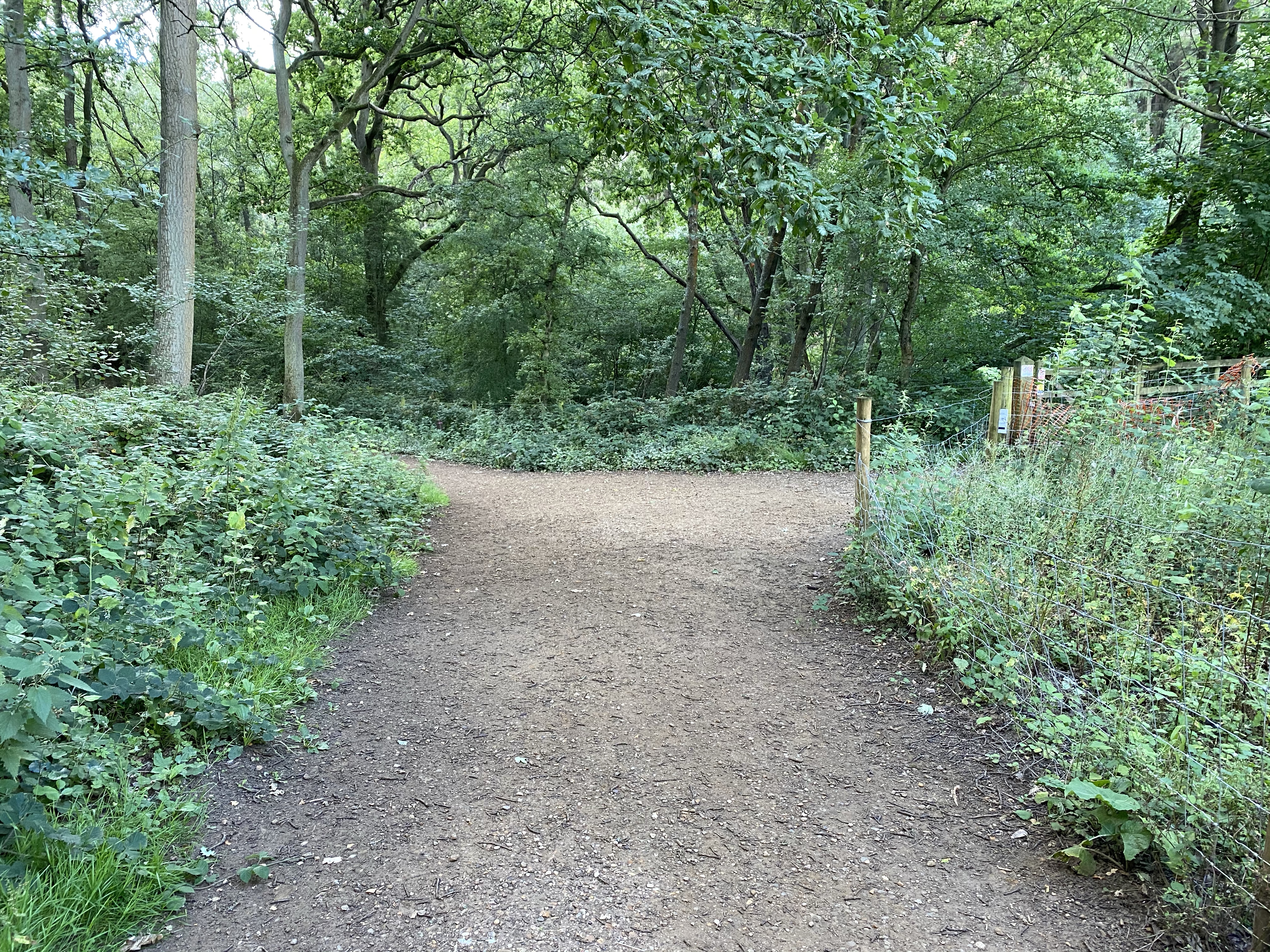 Once inside Stockgrove proper you will walk through the carpark with the building in front of you. Keep an eye out for entrance to the path on your left between parking spots. Go to the path and turn right. Follow this path straight forward. You will see a pond on your right with an the remains of an old boat house, and a bridge and you will continue past these. You will also see paths into Baker’s Wood on your left during this time. Save that for another day as well. As you come to another fork in the road after ignoring the bridge you will see a tree in the middle of a triangle like junction. Here we turn right.