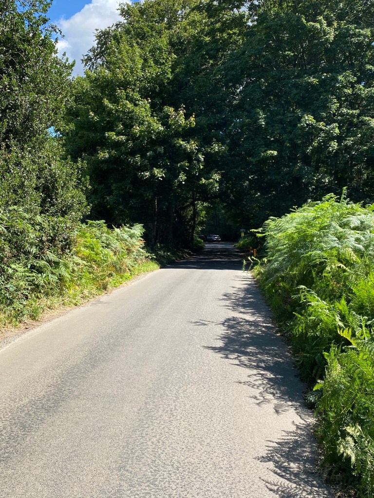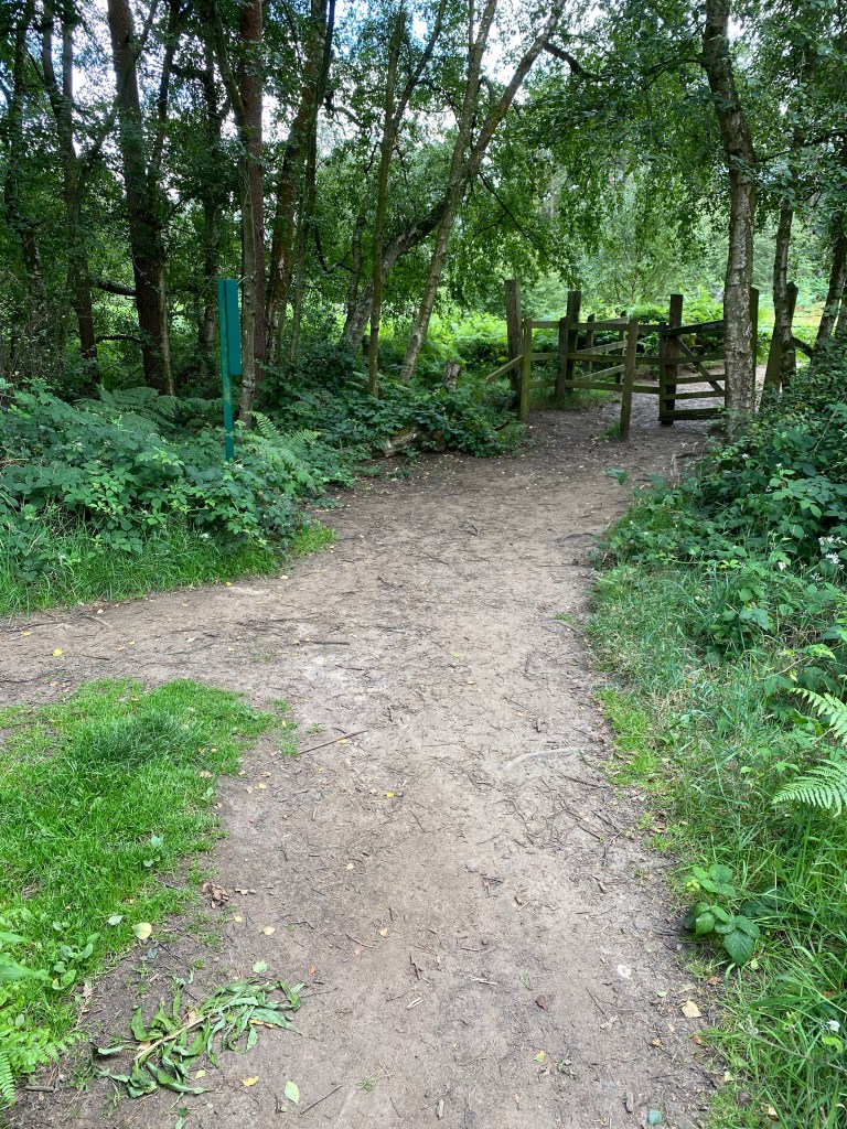At this next junction (see below) you again want to go straight ignoring the turning. We will be walking the extent of this path until we reach a gate. Just by the gate is a right turn which is our path. It is a lovely path lined with ferns on both sides and beautiful views over the fields beyond.