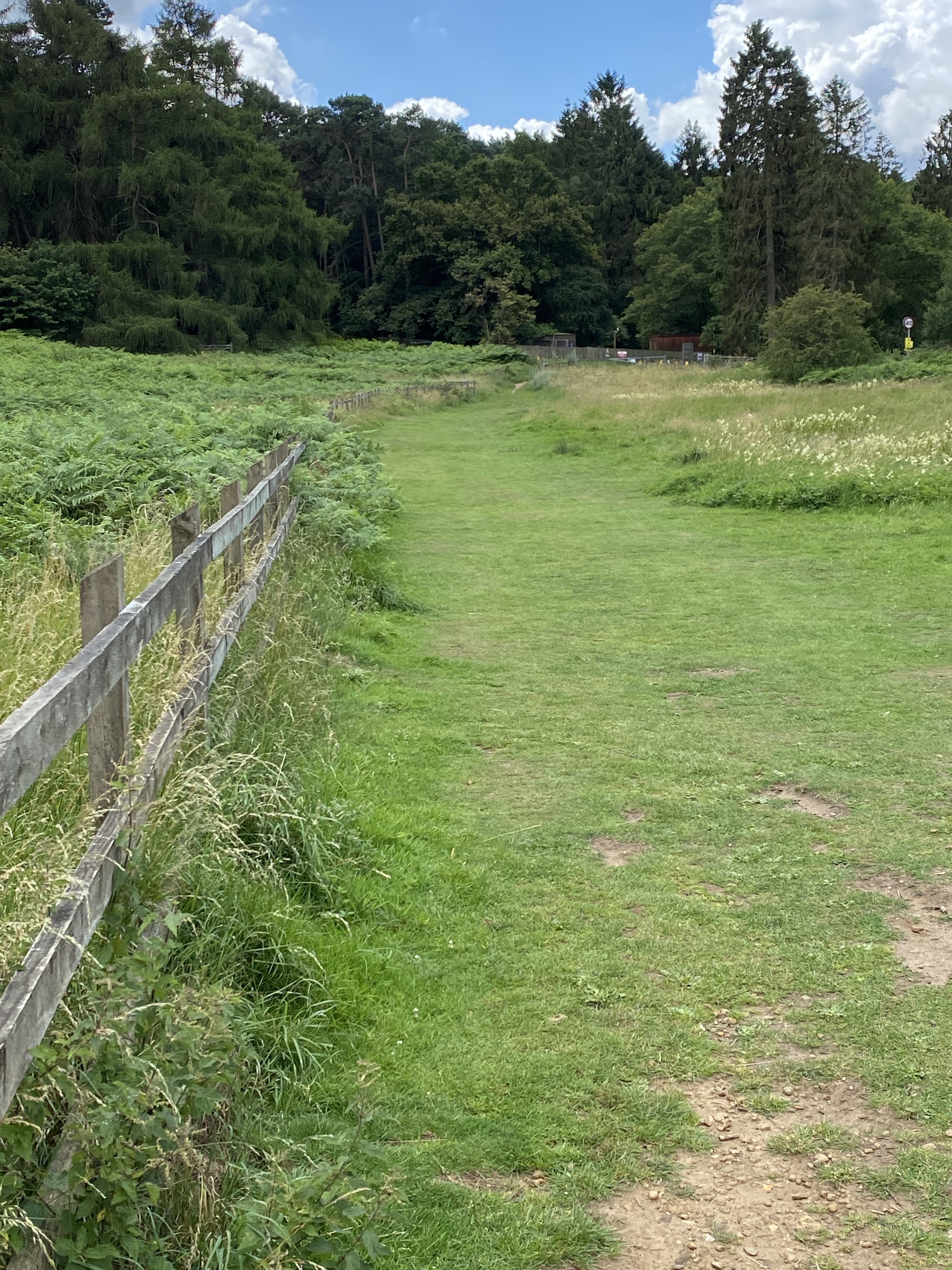 Not long after you have passed the left path you will come upon a kissing gate which you will go through. This path will continue until you reach a field with a fence and a path on the far side of that fence. Turn left and head for Stockgrove Park on the other side of the road.