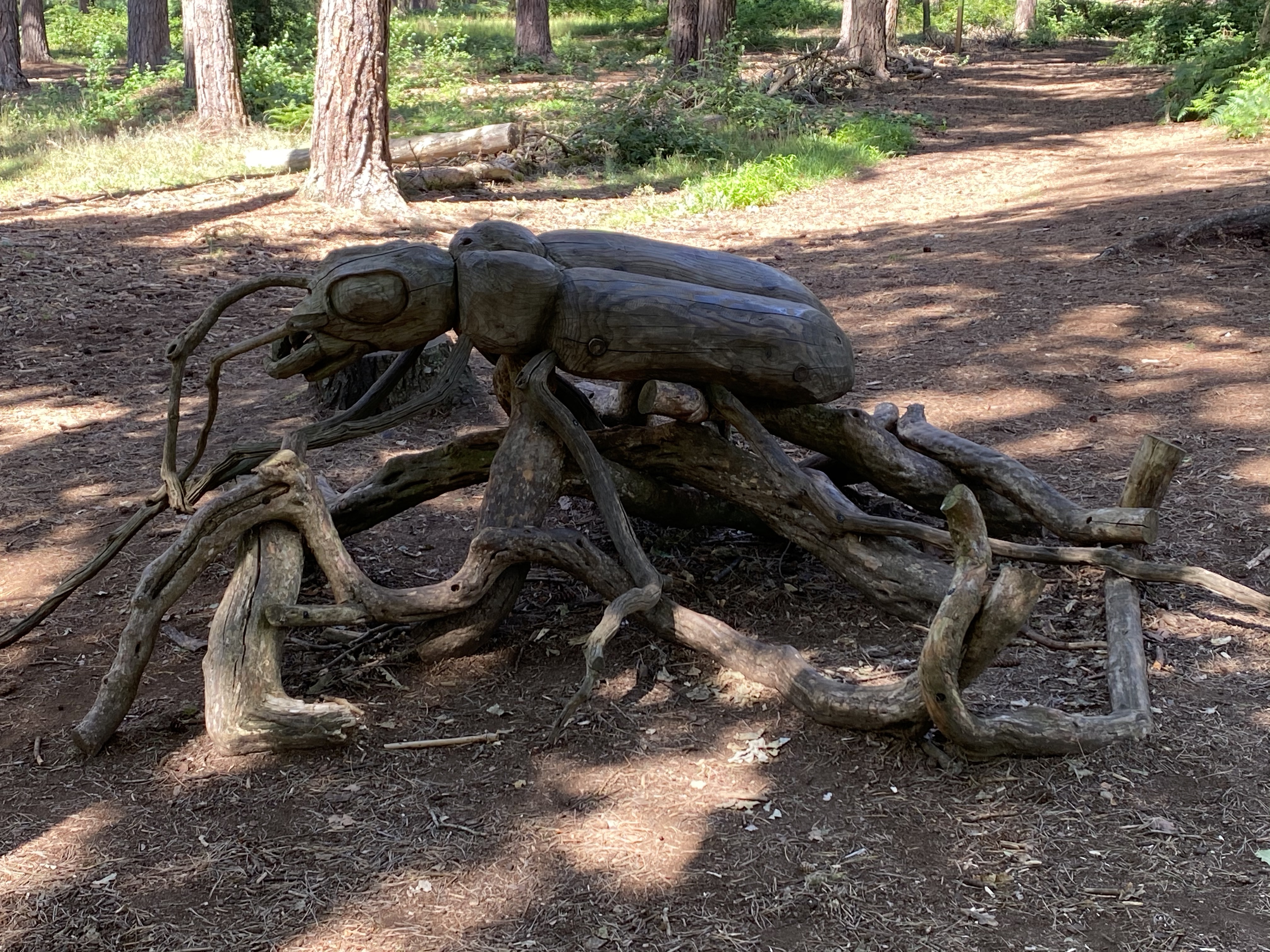 Along this path you will come to a gate. Continue through. This path has several paths off of it as well as a rather awesome sculpture of a beetle on the left. You will need to watch for an intersection of paths in Oak Woods. At that intersection you will see a direction sign saying Brickhill Road on the right and another green sign. Turn right here.