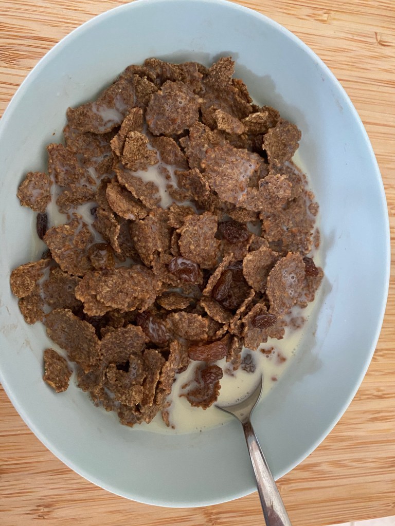 After a bit of Facebook and talking about where to walk and when I looked at the weather forecast….RAIN! I hate walking in the rain mostly due to wearing glasses. So we decided on a walk in the woods as soon as possible as the rains were meant to be early afternoon. This meant breakfast was a rush of just Sultana Bran (that is Raisin Bran for those not in the know). You can’t tell in the picture but it was probably at least 3 servings of cereal.
