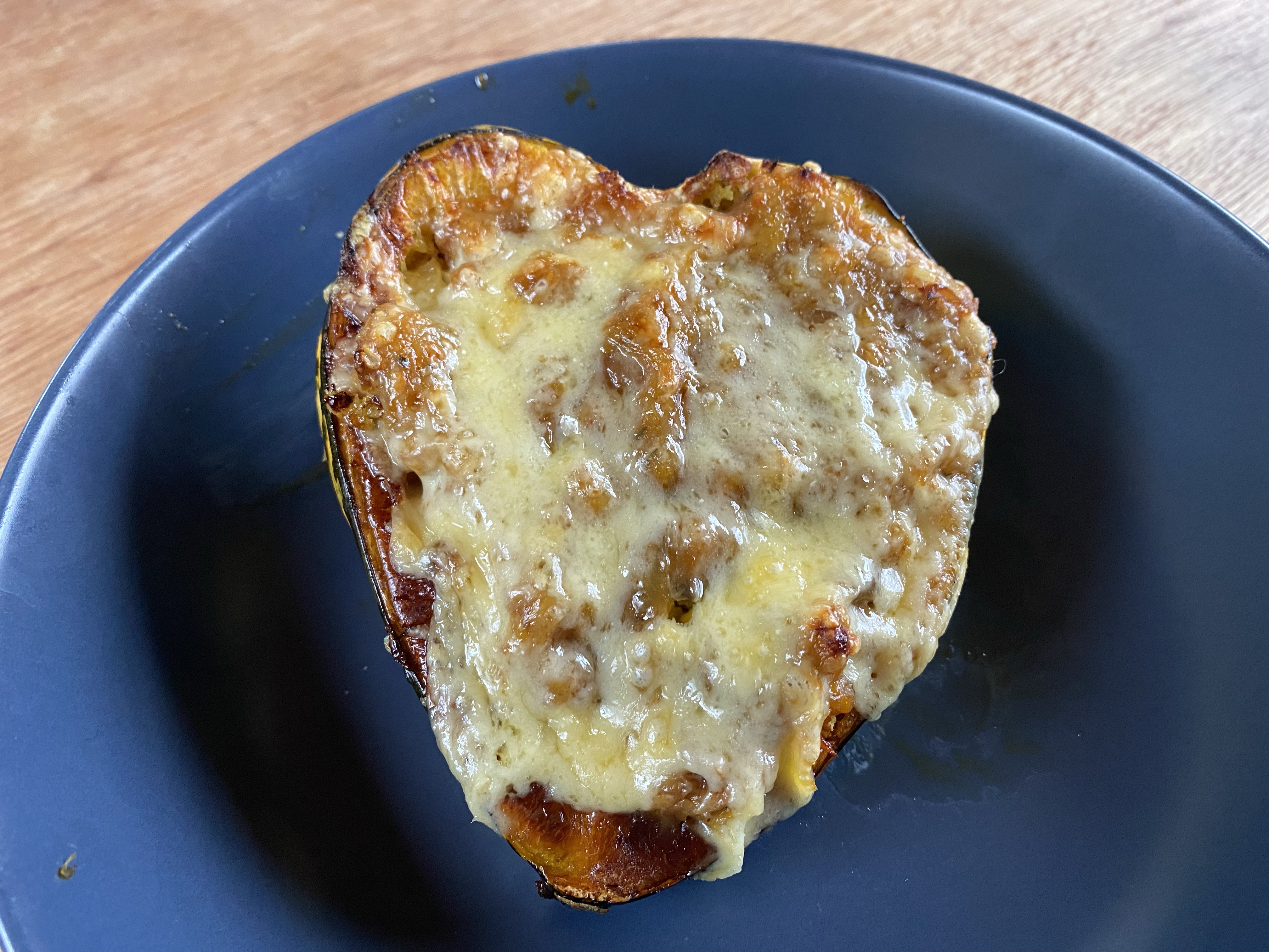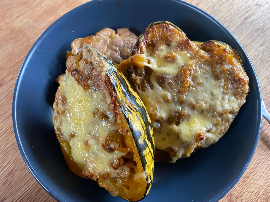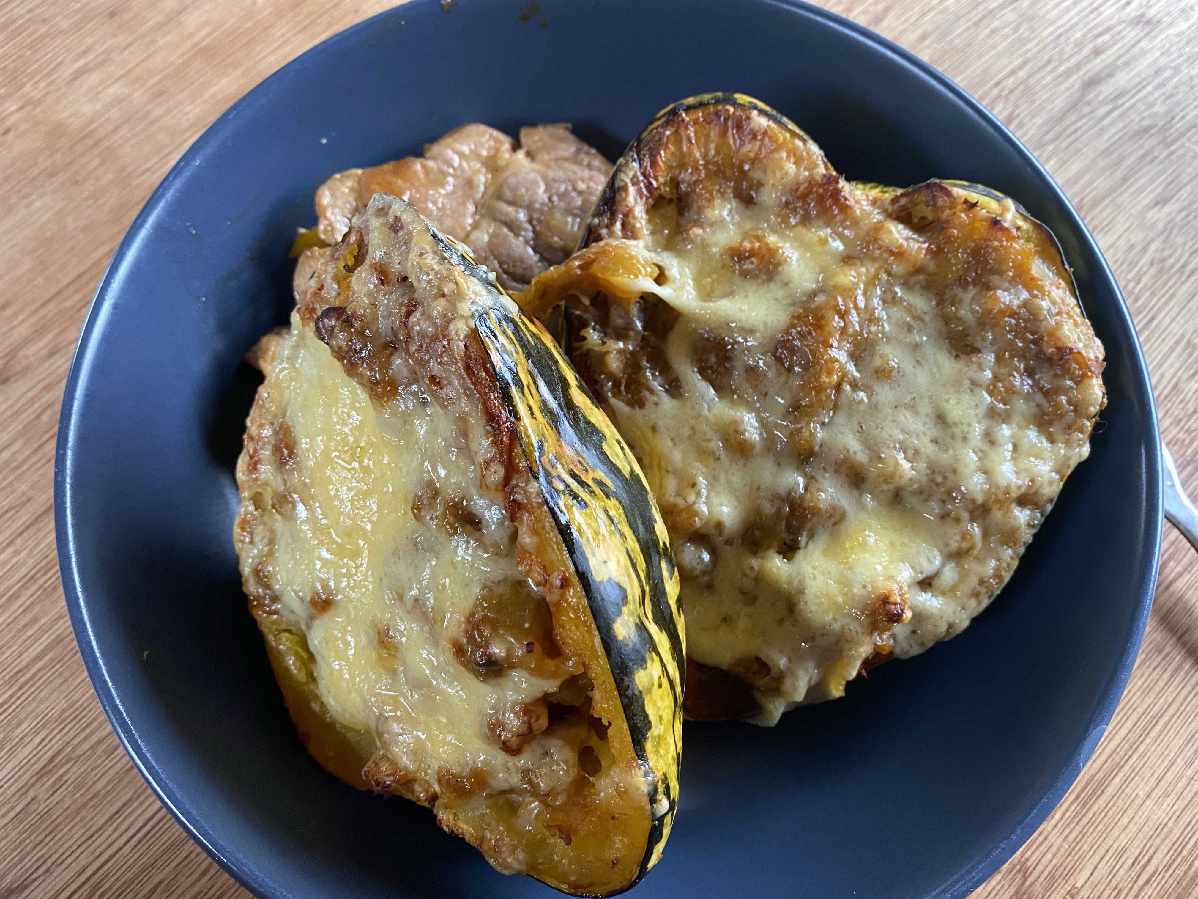 This recipe will work for two main meals or four side dishes. I will admit that we used it as two side dishes and were gluttonous. If you are a meat eater this pairs really well with pork but I would think any would work. If you are vegetarian or vegan you might consider adding another protein source like beans on the side or maybe add a bit of cooked lentils into the vegetable mix before stuffing the squash and melting the cheese.
